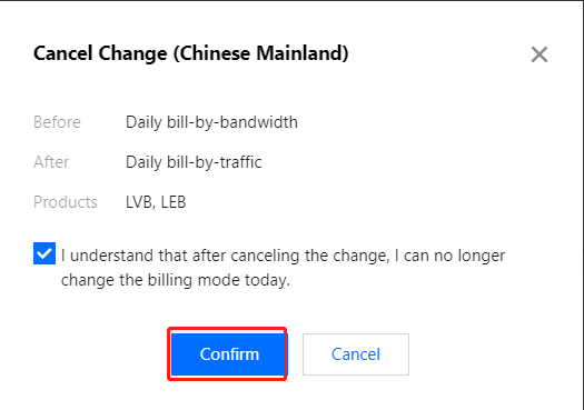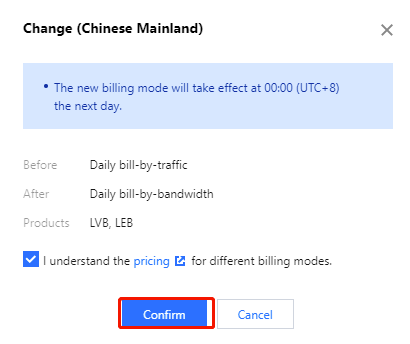 利用中に課金方式について疑問点がある場合は、課金方式を再度選択可能です。日次トラフィック課金と帯域幅課金間の切り替えは翌日に有効になり、日次課金から月次課金への変更は承認後の翌日に有効になり、月次課金から日次課金への変更は承認後の翌月に有効になります。