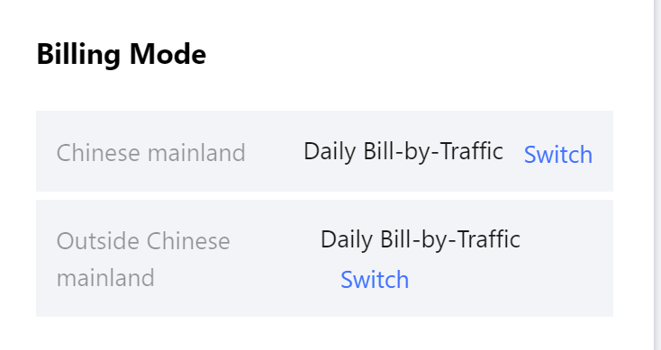 1. CSSコンソールにログインし、左側のディレクトリで 概要をクリックし、概要ページに進みます。 2. 課金方式タグを確認します。中国大陸(中国本土)またはグローバル/中国香港・中国マカオ・中国台湾(中国本土以外)の課金方式を選択することができます。切り替えをクリックします。
