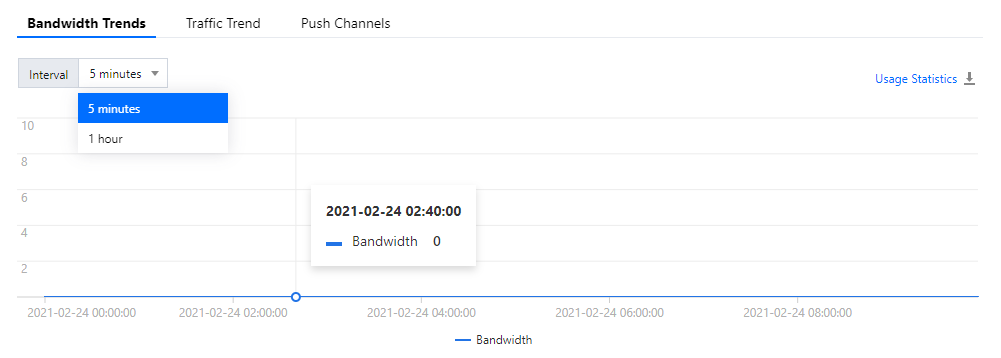 当日のビデオライブストリーミングのダウンストリーミング帯域幅ピーク値、ダウンストリームトラフィック使用量の状況を表示し、さらに現在のプッシュチャネル数と当日の同時接続状況を統計します。