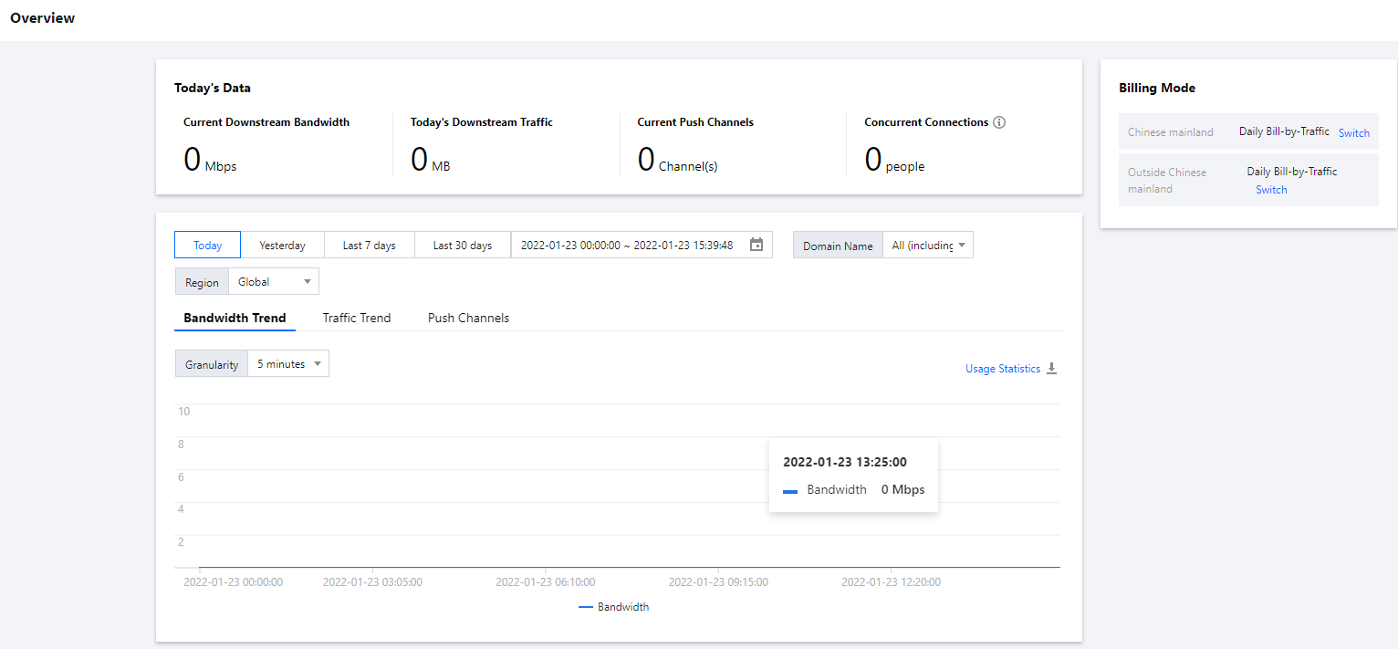 左側のナビゲーションバーの概要をクリックすると、リアルタイムの下り帯域幅、本日の下りトラフィック量、現在のプッシュチャネル数、同時接続数、直近30日間の課金帯域幅、課金トラフィック、プッシュチャネル数の傾向などの関連データを確認することができます。また、必要に応じて課金モードの切り替えや時間粒度を変更することも可能です。ガイドが必要な場合は、右上隅の初心者向けアクセスガイドをクリックして、CSSに入門するための手順とガイドを表示することができます。
