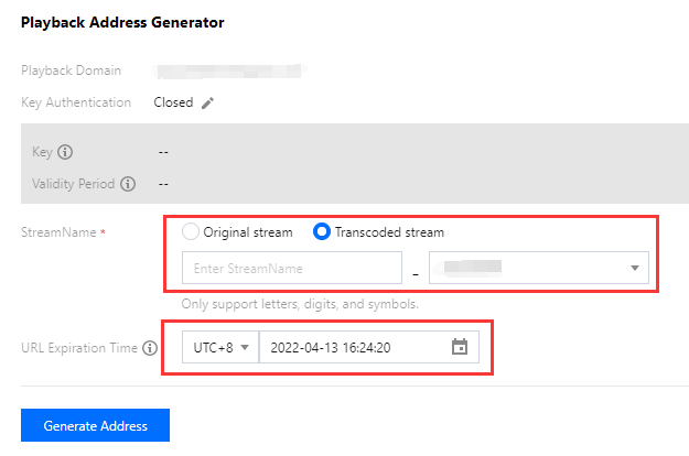 2.2 カスタマイズしたStreamNameを入力します(例:liveteststream)。再生アドレスのStreamNameがプッシュアドレスStreamNameと一致している場合のみ、対応するストリームを再生できます。