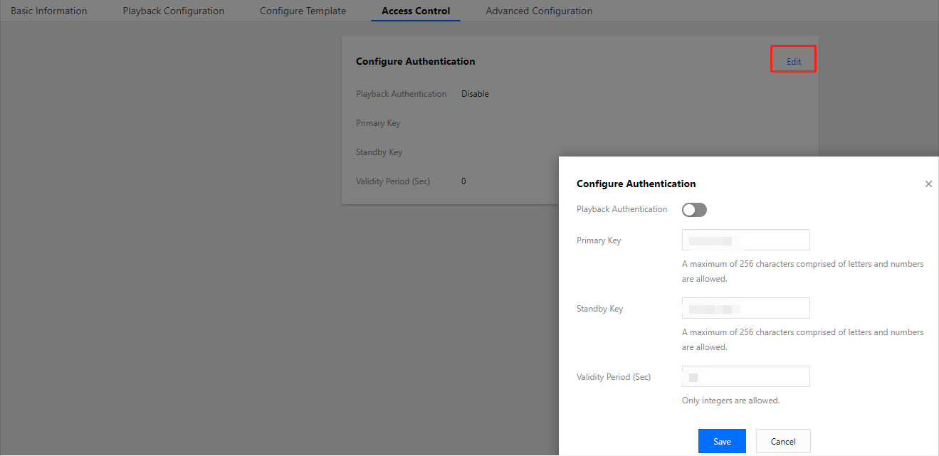 1. ドメイン名管理を選択し、認証設定を行いたい再生ドメイン名または管理をクリックして、ドメイン名管理に進みます。 2. アクセス制御>認証設定で、編集をクリックして認証設定画面に進みます。