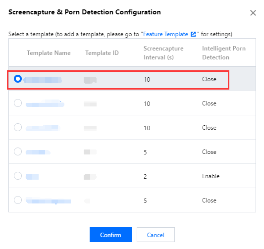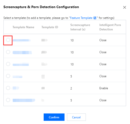 スクリーンキャプチャ、ポルノ検出のテンプレート設定後、スクリーンキャプチャ・ポルノ検出結果を受け取るために、コールバックテンプレートを同時に設定する必要があります。コールバックテンプレートの設定については、コールバック設定をご参照ください。 1つのドメイン名は、1つのスクリーンキャプチャ・ポルノ検出テンプレートにのみ関連付けることができます。関連付けた後、そのドメイン名の下のすべてのストリームは、このテンプレートに従ってスクリーンキャプチャ、ポルノ検出されます。