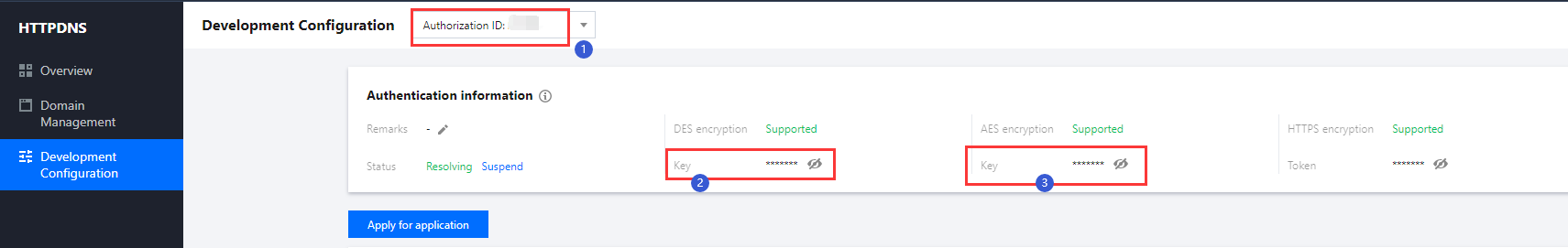 1. HTTPDNSサービスをアクティブ化するには、Tencent Cloudのモバイル解決HTTPDNSコンソールのサービス アクティブ化の手順をご参照ください。 2. 開発設定ページに進み、承認ID、 DESキーの認証情報を確認します。 HTTPDNSを使用したアップストリームプッシュのスケジューリング