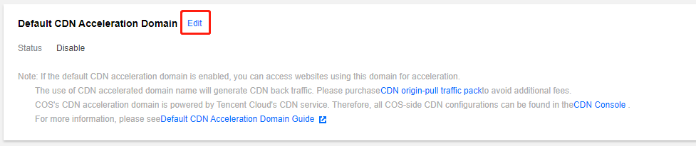 5. 業務の必要性に応じてCOS bucketのCDNアクセラレーションを有効にすることができます。作成済みのバケット名または設定管理をクリックし、左側のドメイン名と伝送管理>デフォルトのCDNアクセラレーションドメイン名をクリックします。デフォルトのCDNアクセラレーションドメイン名設定項目の編集をクリックし、現在のステータスを有効に設定した後、下部のオプションを設定します。具体的な設定方法については、デフォルトのCDNアクセラレーションドメイン名の有効化をご参照ください。設定完了後、保存をクリックすれば、CDNアクセラレーションが有効になります。 CSSのスクリーンキャプチャ保存を承認