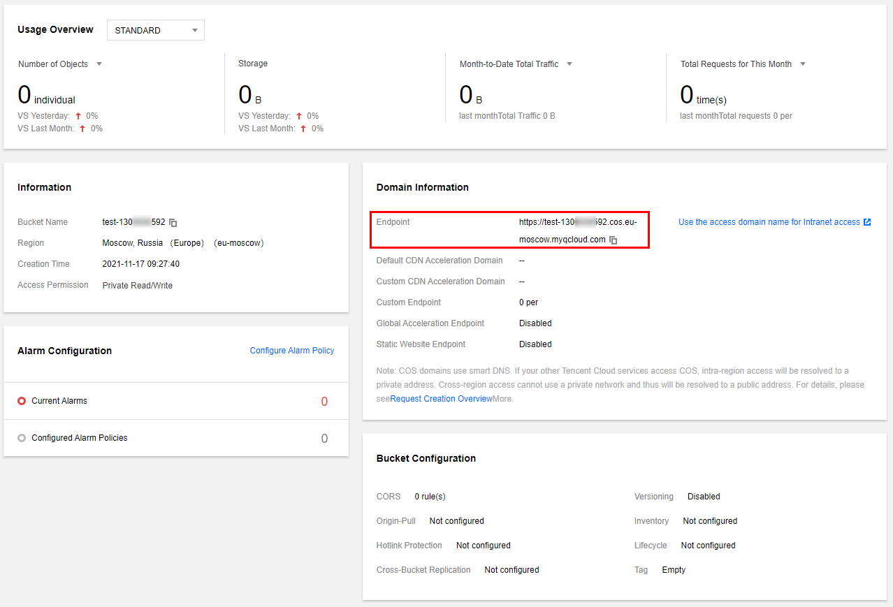 4.1 バケットの概要でCOSのすべての情報を確認できます。アクセスドメイン名(オリジンサーバードメイン名)はbucket name、cos appid、bucket regionを含みます。 bucket name: test