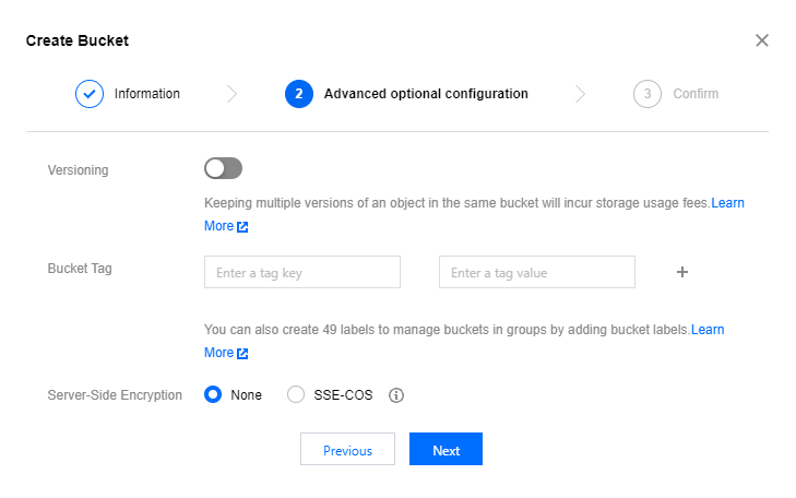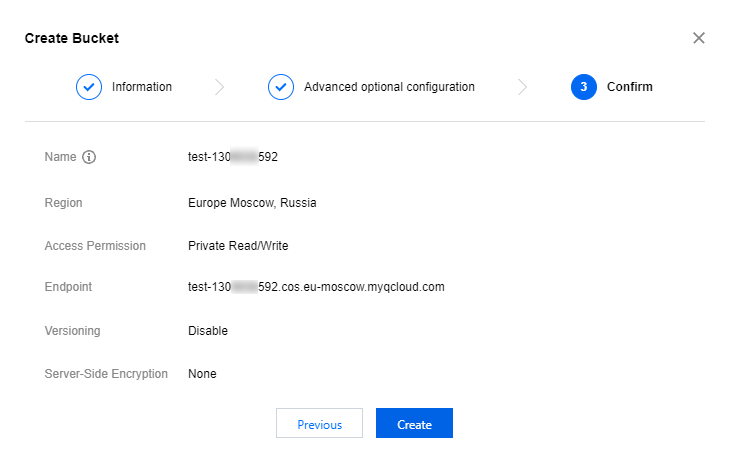 4. 設定情報を確認し、作成をクリックし、COS Bucketが作成できます。