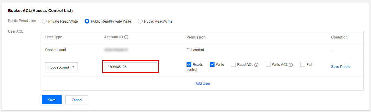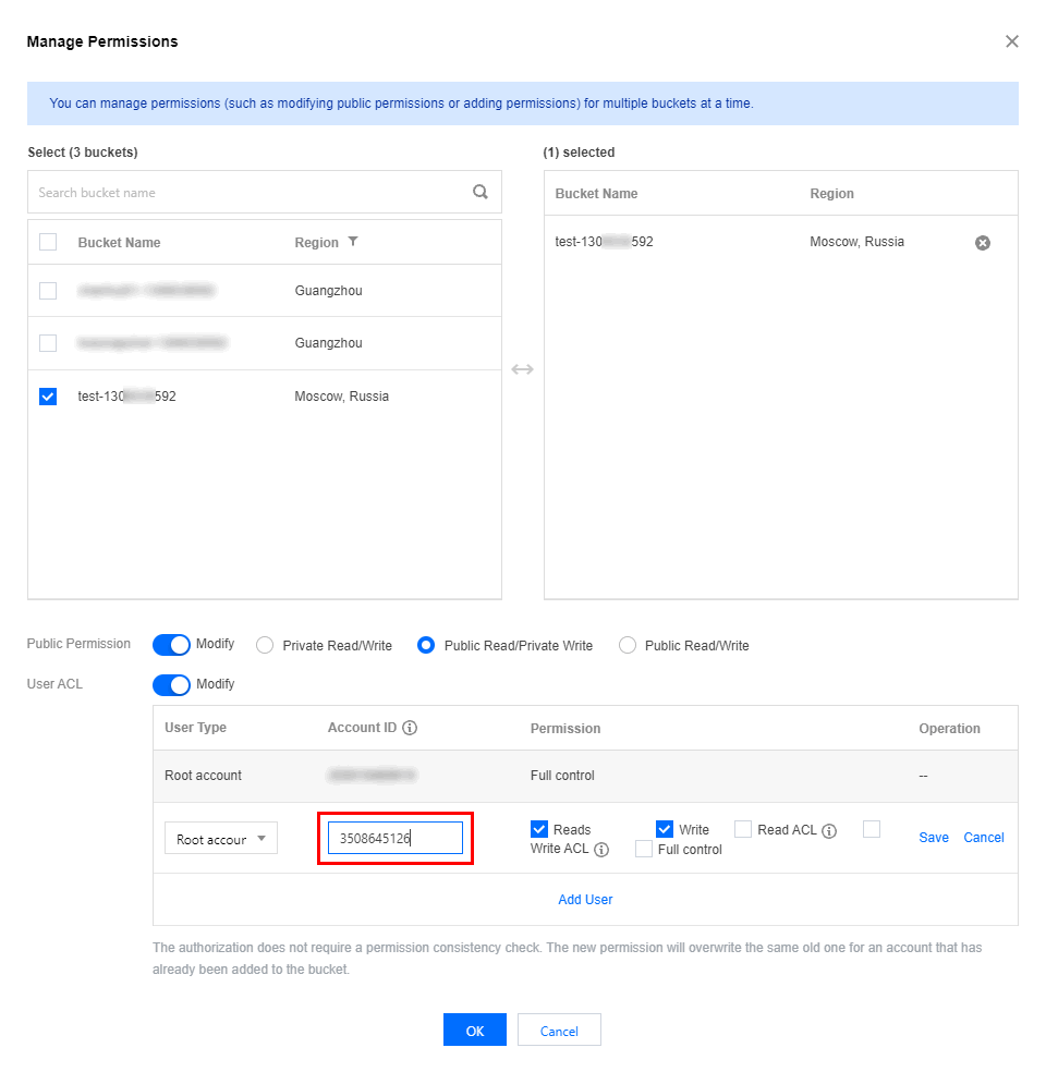2. バケットのバケットリストで権限を与えるバケットを選択し、右側の設定管理をクリックしてバケット管理インターフェースに入ります。権限管理>バケットアクセス許可を選択してユーザーを追加します。ユーザータイプでルートアカウントを選択し、ルートアカウントID:3508645126を入力して、保存をクリックします。 または、権限管理をクリックし権限管理インターフェースに入り、権限を与えるバケットにチェックを入れ、パブリック権限とユーザー権限ボタンを開いてユーザーを追加します。ユーザータイプでルートアカウントを選択し、ルートアカウントID:3508645126を入力し、保存をクリックしてOKをクリックします。