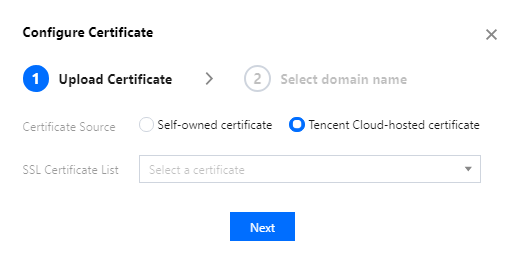 3. 証明書設定のポップアップウィンドウで証明書のアップロード方法を選択します。Tencent Cloudでは2種類の証明書ソースをサポートしています: