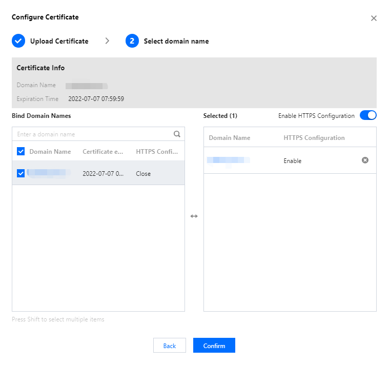 5. 「関連付けられたドメイン名」欄で証明書のドメイン名を基に、符合した再生ドメイン名をフィルタリングして選択すれば、複数を選択できます。現在のドメイン名をほかの証明書にバインドしている場合は、上書きして証明書を更新します。