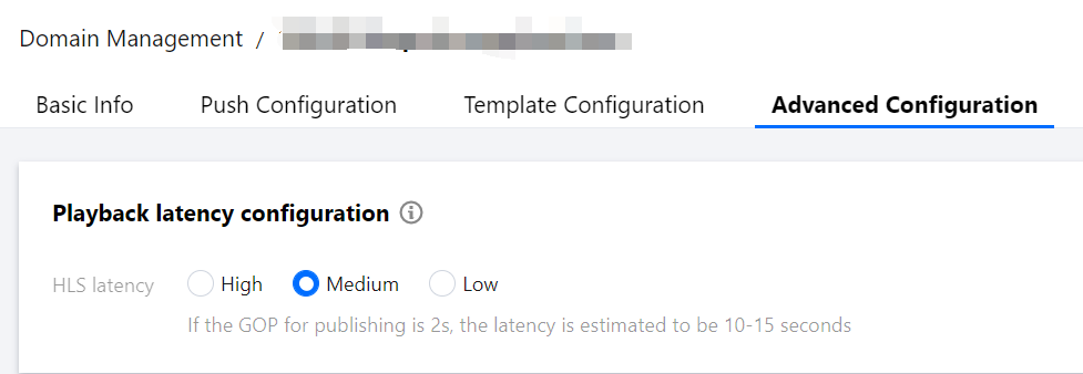 1. ドメイン名管理を選択し、HLS遅延設定を行いたいプッシュドメイン名または右側の管理をクリックして、ドメイン名管理ページに進みます。 2. 高度な設定でHLSの遅延設定を行うことができます。
