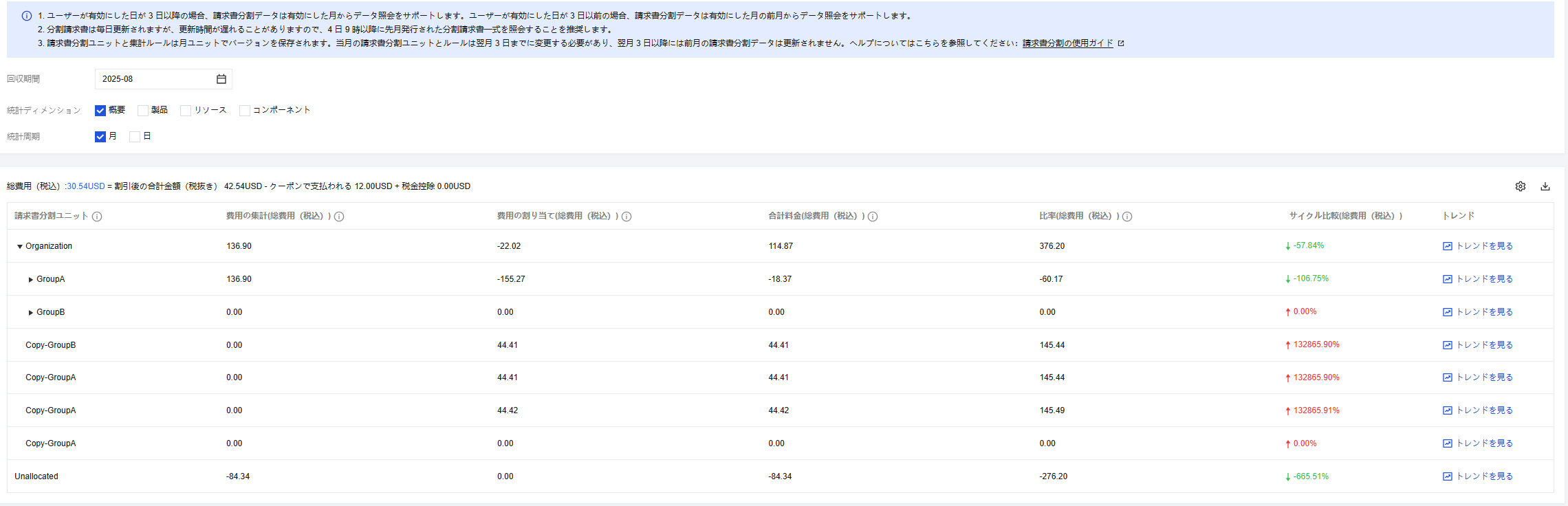 帰属費用(クーポン利用金額) | 集計ルールに基づいてコスト配分ユニットに直接集計されたリソースのクーポン利用金額 |