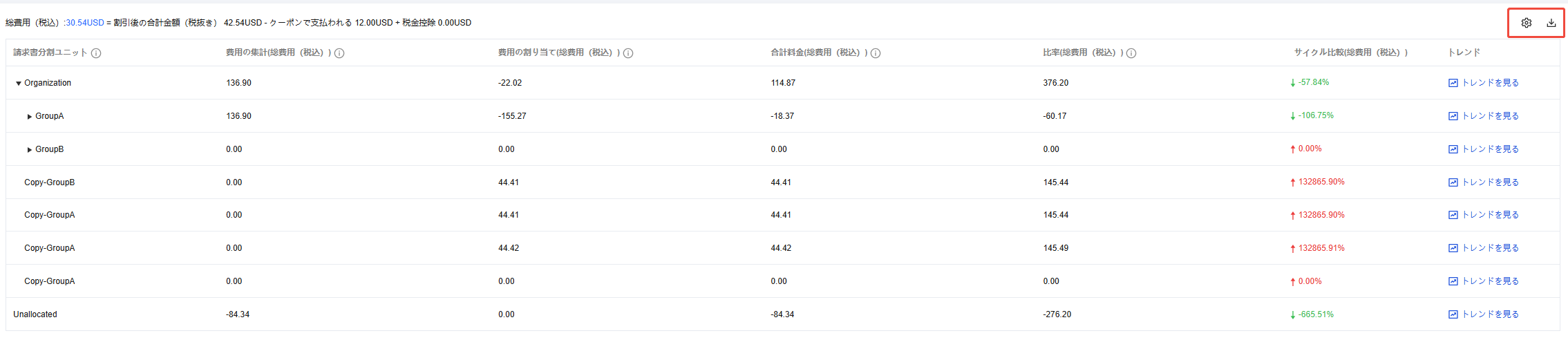 帰属費用(総額(税込み)) | 集計ルールに基づいてコスト配分ユニットに直接集計されたリソースの総額(税込み) |