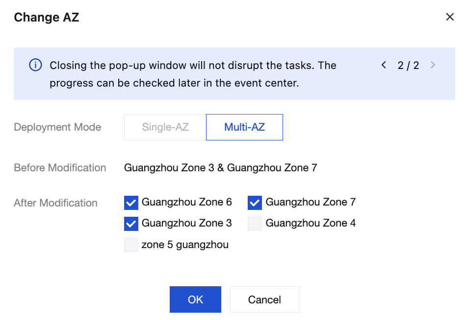 Changing AZs requires data migration. It is recommended to schedule the change operation during off-peak hours.
