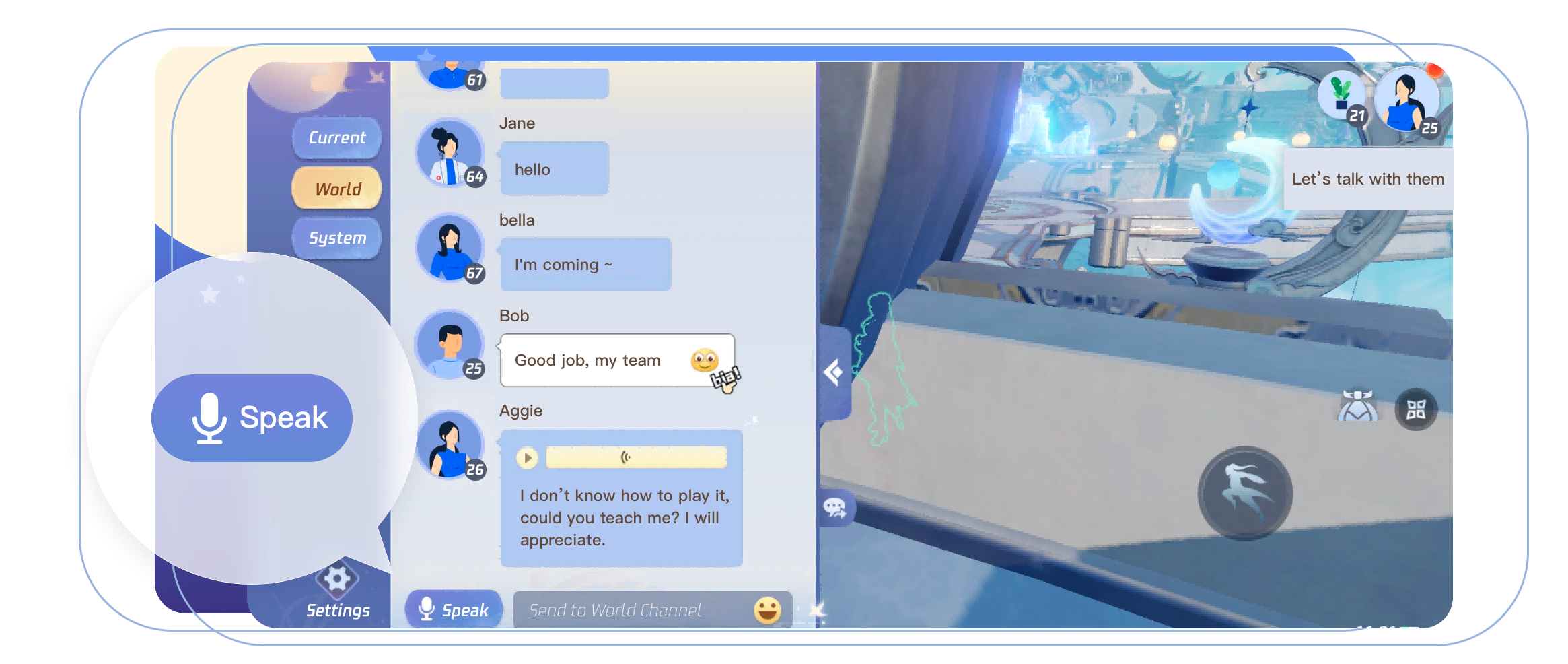 ゲーム内の世界チャンネルや友達チャンネルで音声メッセージを送る時、話しながらテキストに変換して転送することをサポートします。また、ショートオーディオを直接録音し、受信側でショートオーディオのダウンロード・再生、ボイスツーテキスト変換、テキスト翻訳を行います。オーディオを125言語に認識でき、低遅延で、ゲームチャンネル内での多言語コミュニケーションを実現します。