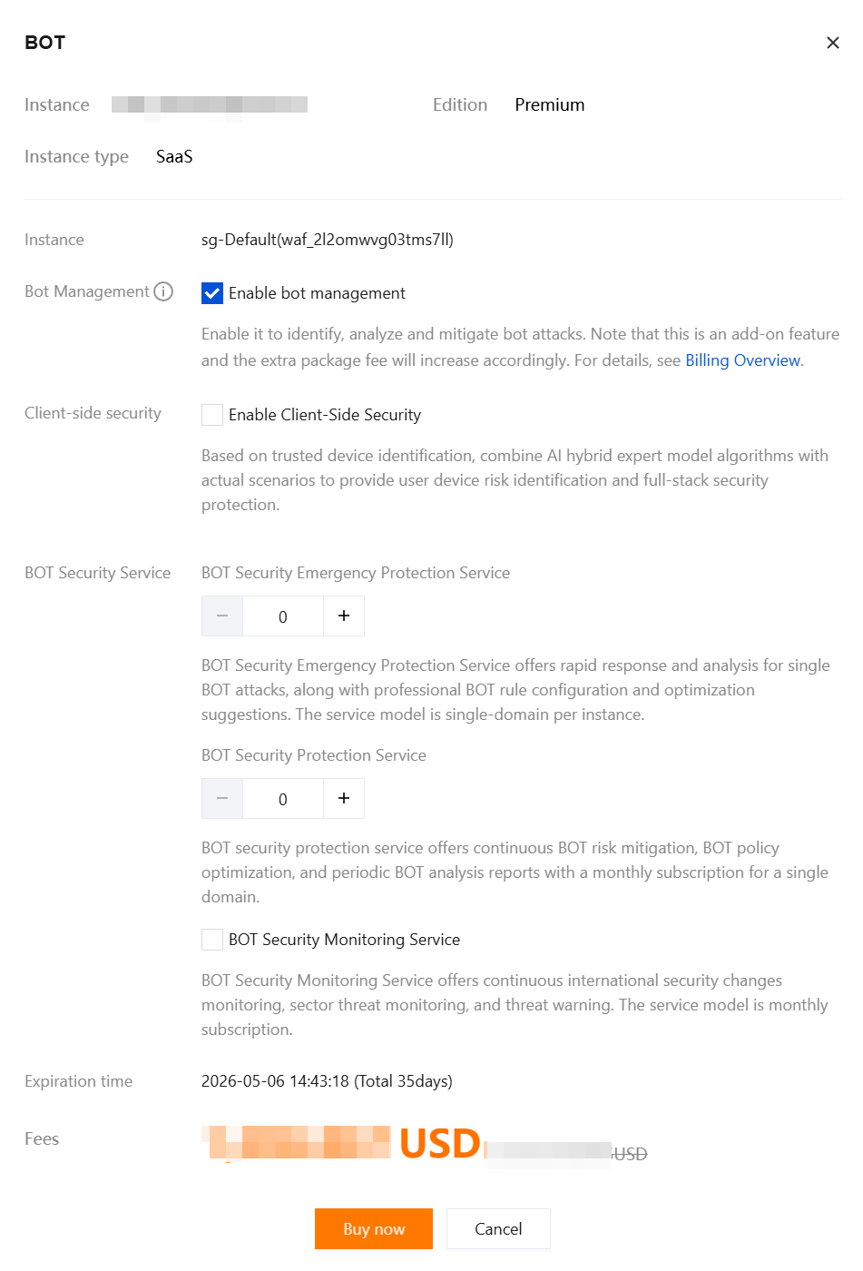 2. In the BOT pop-up window, select the required services, and click Buy now.