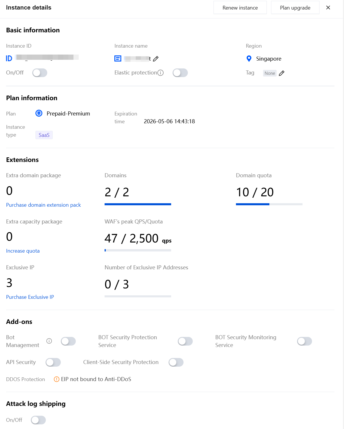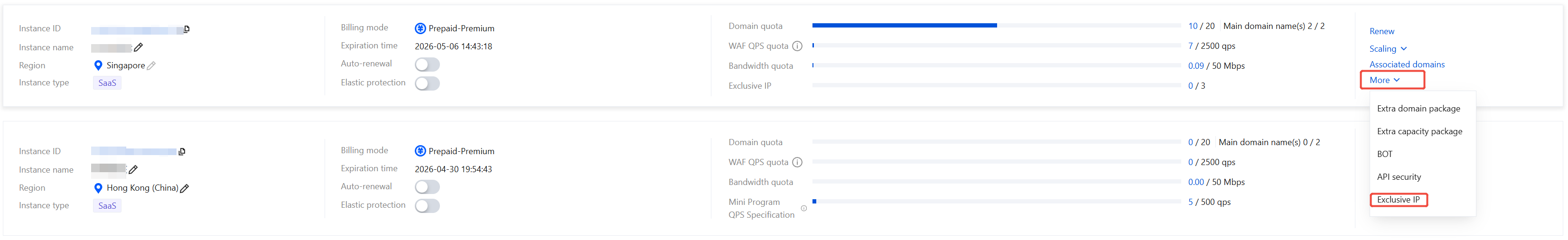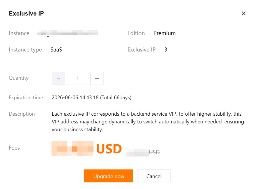 Only SaaS WAF supports Exclusive IP. To enable this feature, submit a ticket or contact your dedicated account manager to apply for purchase. 2. In the Exclusive IP pop-up window, select the purchase quantity, and click Upgrade now.