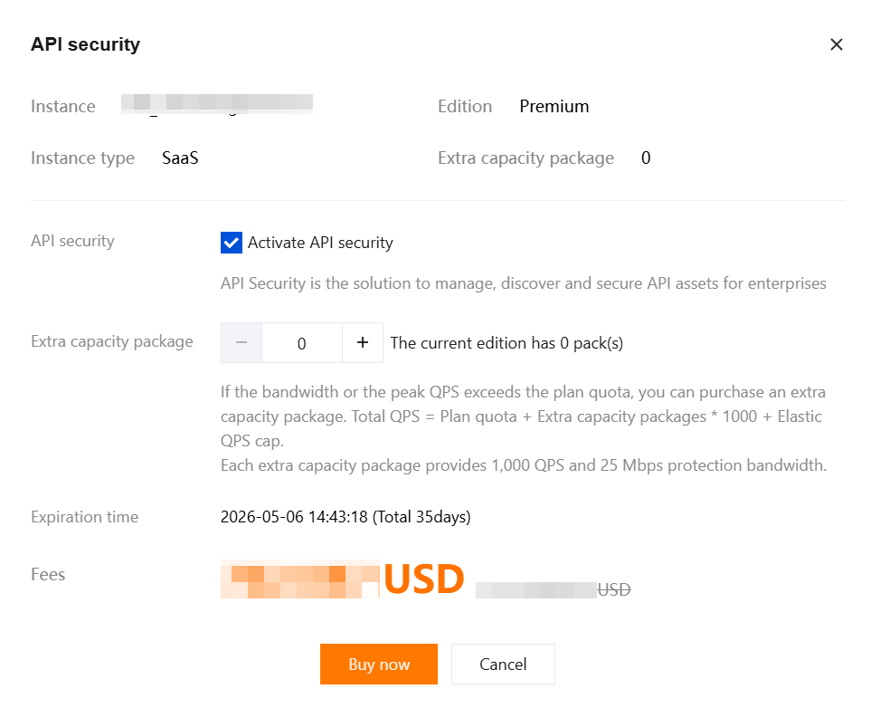 2. In the API security pop-up window, select the required services and specify the quantity of Business Extension Packs, then click Buy now.