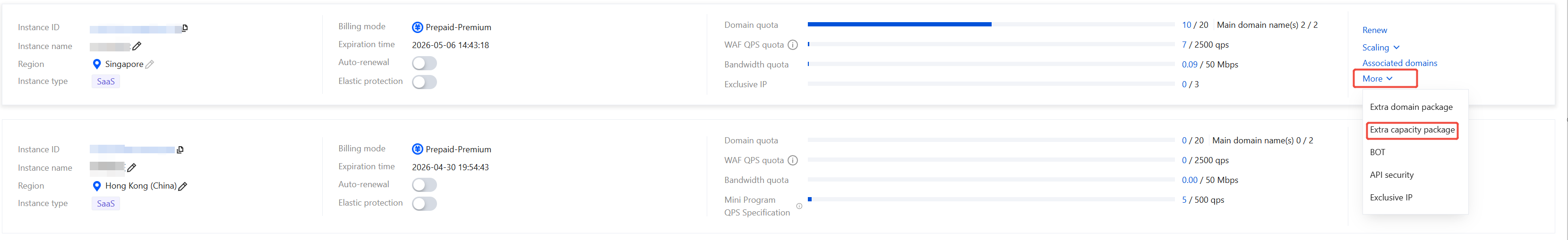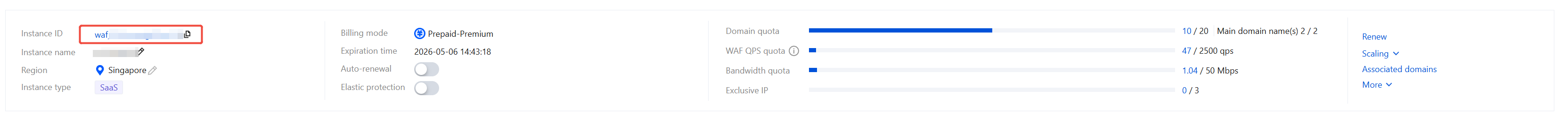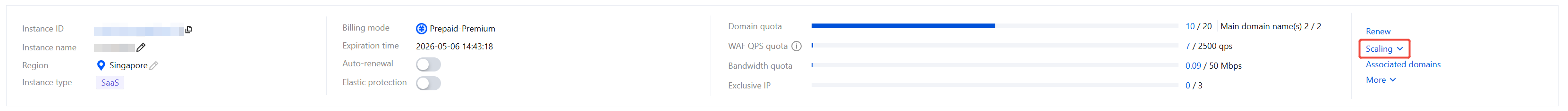 1. Log in to the WAF console, and in the left navigation, choose Connection Management > Instance Management. 2. On the Instance Management page, select the desired instance, and click Scaling.
