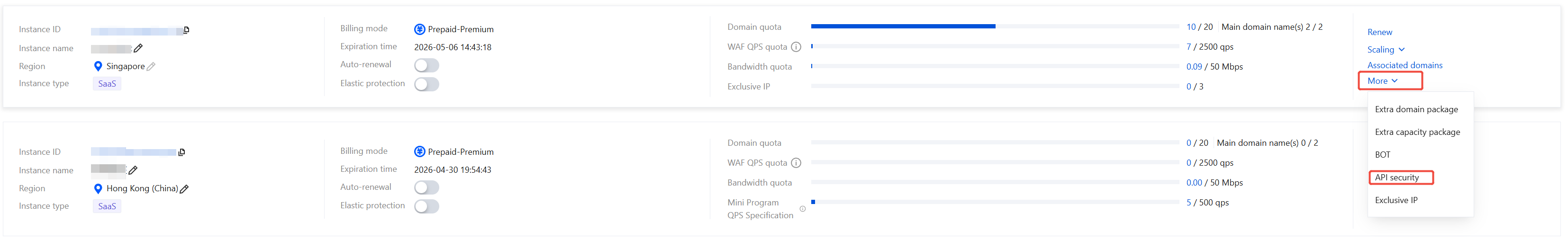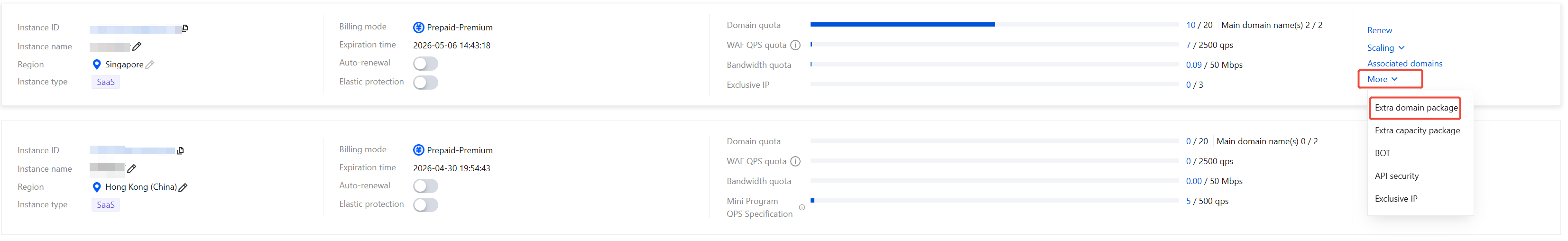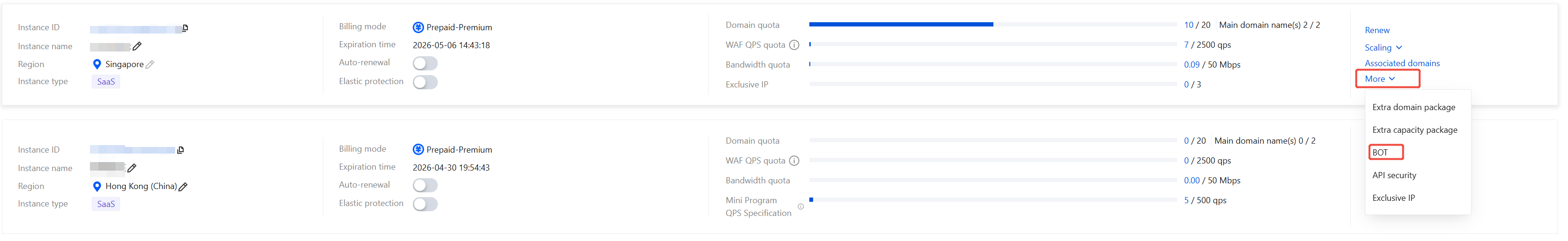 1. Log in to the WAF console, and in the left navigation, choose Connection Management > Instance Management. 2. On the Instance Management page, select the desired instance, and click Scaling.