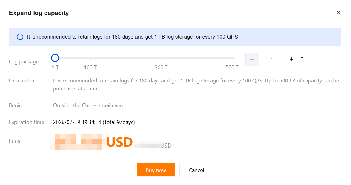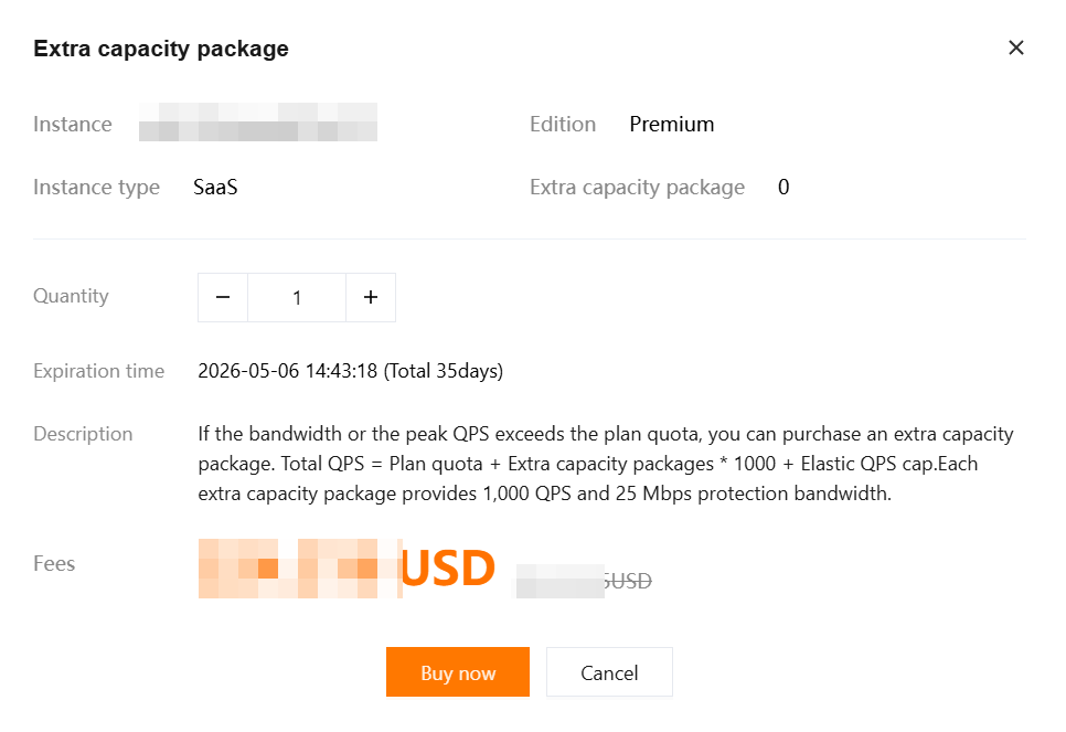 2. In the Extra capacity package pop-up window, select the purchase quantity, and click Buy now.