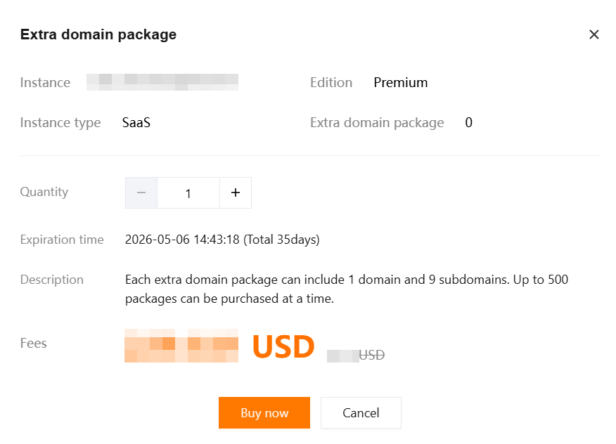 2. In the Extra domin package pop-up window, select the purchase quantity, and click Buy now.