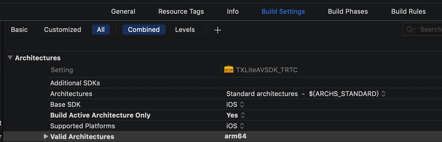 アップルiPhone5s以上のバージョンの携帯電話はいずれもx64 アーキテクチャのみでのパッケージ化をサポートできます。XCodeの中のBuild Settingで、Build Active Architecture Onlyの設定をYESにし、同時に、Valid Architecturesに arm64と書き込むだけで済みます。TRTC SDK のシングルアーキテクチャのipa増加量は僅か1.9Mです。