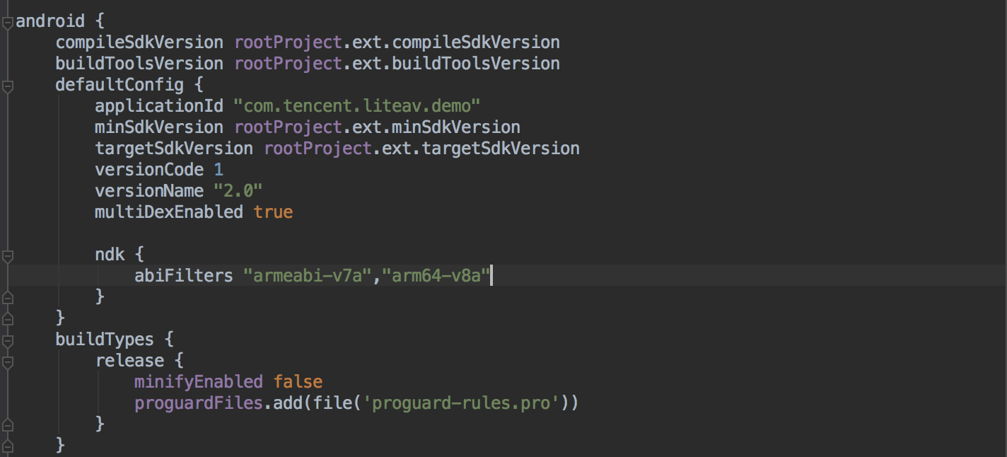 具体的な操作方法:現在のプログラムの build.gradleの中に abiFilters "armeabi-v7a"を追加してシングルアーキテクチャのso ファイルのパッケージ化を指定するか、または `abiFilters "armeabi-v7a","arm64-v8a"を追加してデュアルアーキテクチャの soファイルを指定します。