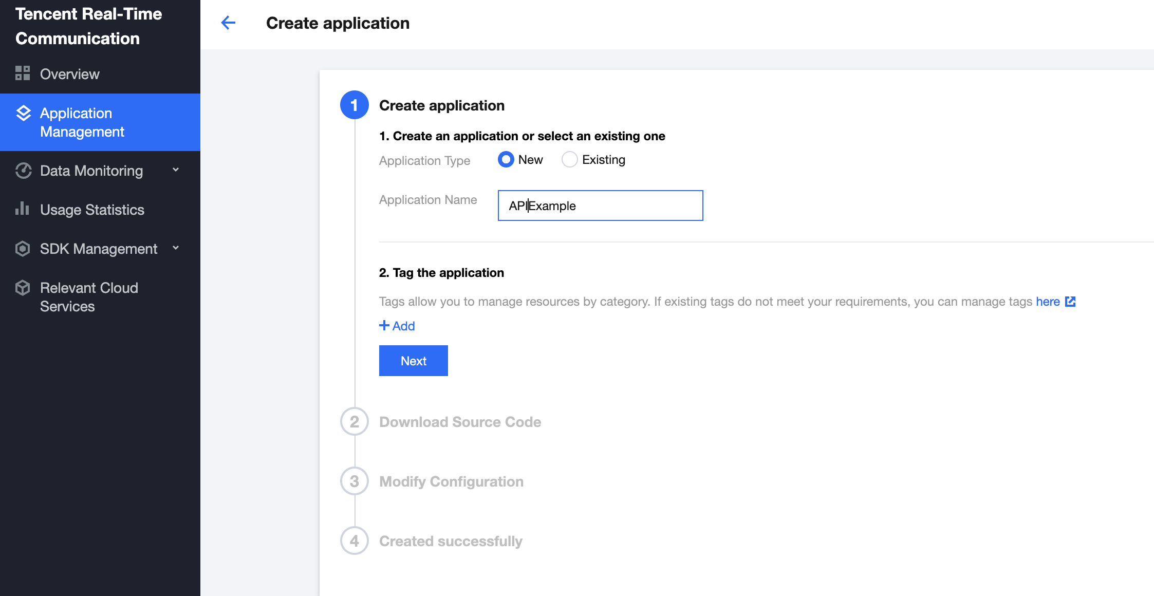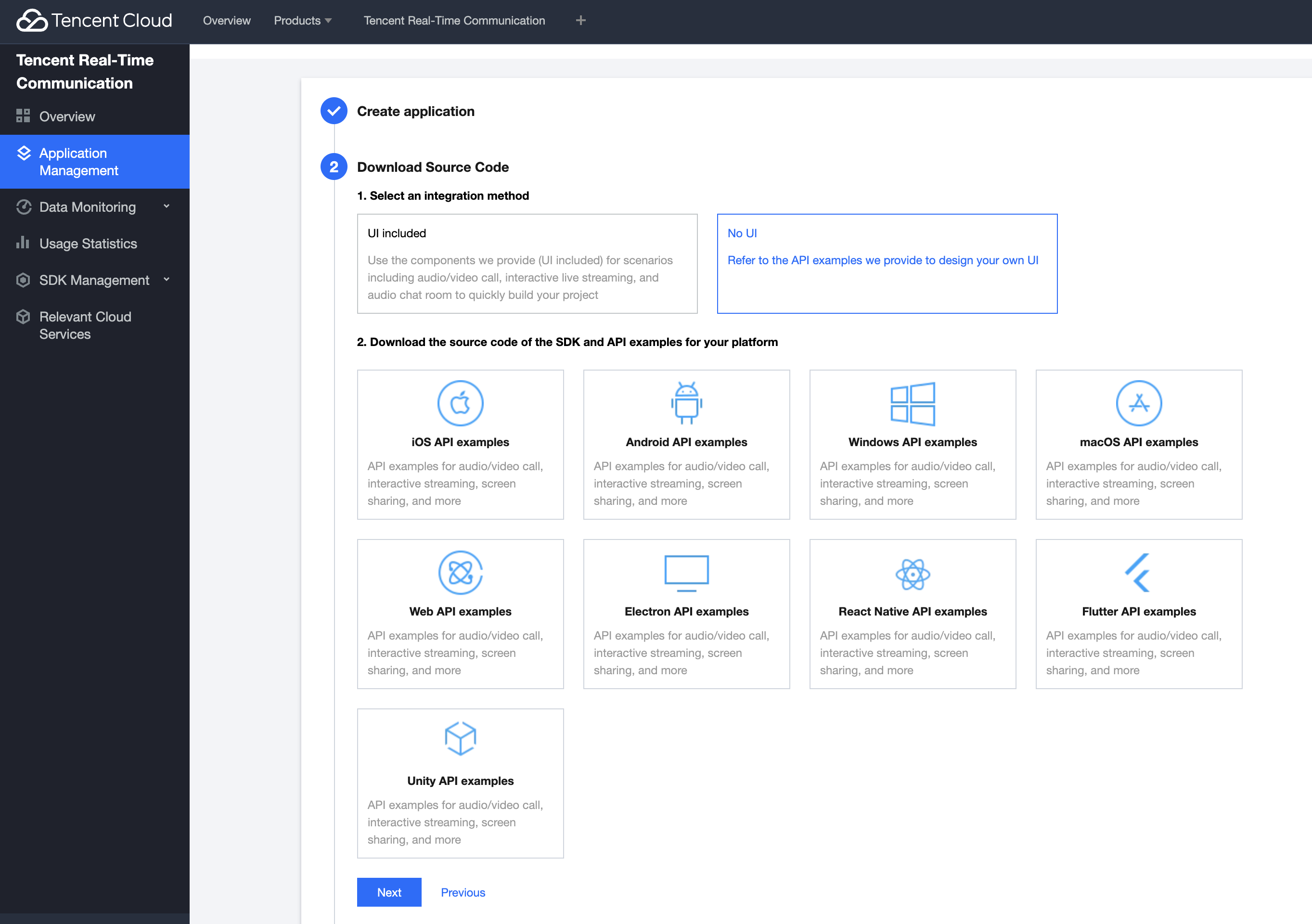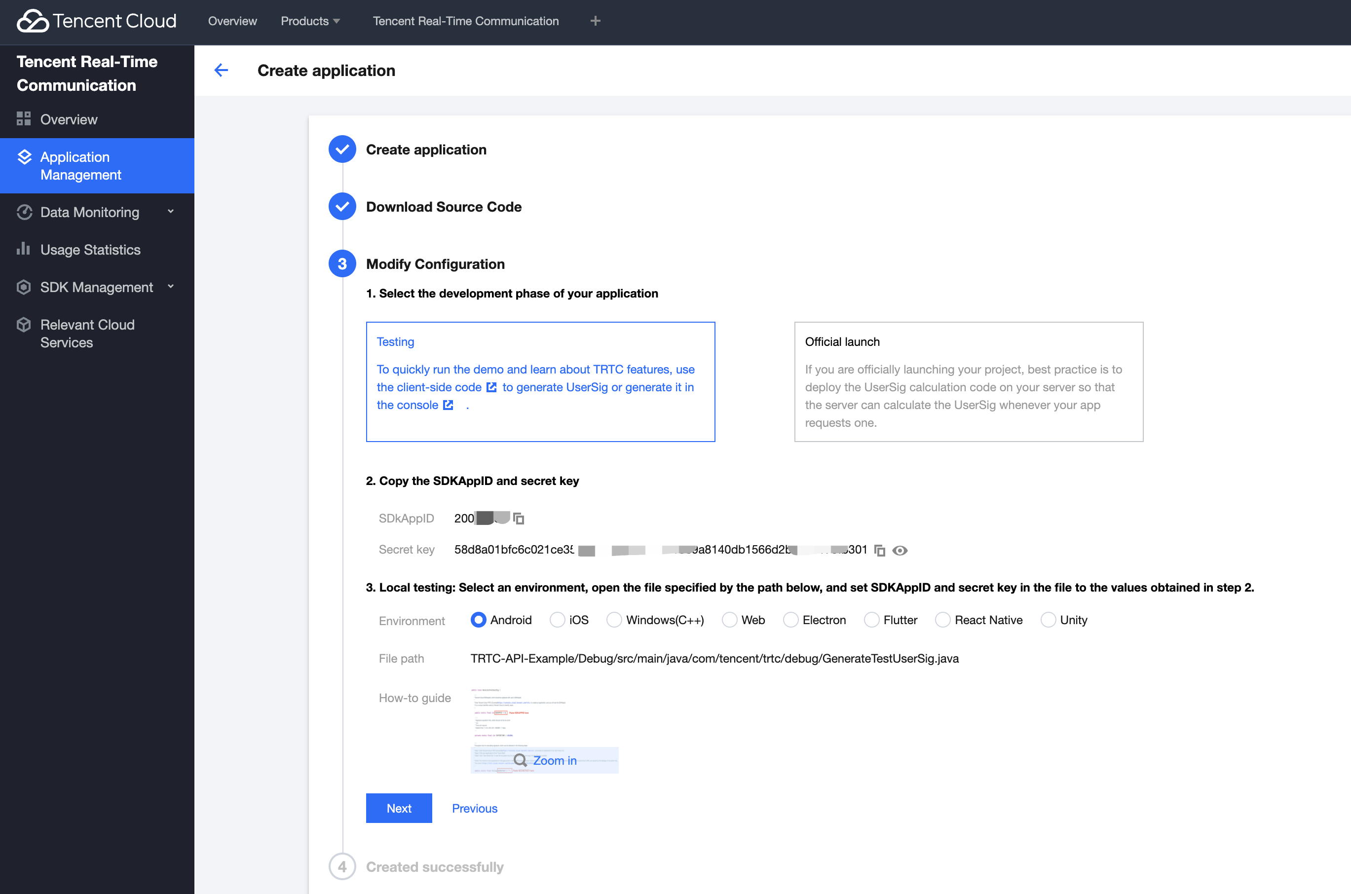 1. サンプルプロジェクトのクイックスタート段階で【デバッグ段階】を選択します。その後、ご自身のSDKAppID、Secret keyを記録しておきます。