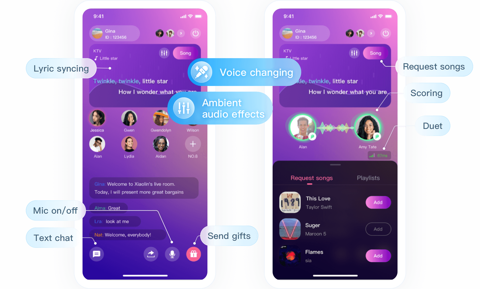 // 送信側:カスタマイズした「CMD_GIFT」によってギフトメッセージを区別mTRTCKaraokeRoom.sendRoomCustomMsg("CMD_GIFT",date, new TRTCKaraokeRoomCallback.ActionCallback() {@Overridepublic void onCallback(int code, String msg) {if (code == 0) {//送信に成功}}});// 受信側:ギフトメッセージのモニタリングmTRTCKaraokeRoom.setDelegate(new TRTCKaraokeRoomDelegate() {@Overridepublic void onRecvRoomCustomMsg(String cmd, String message, TRTCKaraokeRoomDef.UserInfo userInfo) {if ("CMD_GIFT".equals(cmd)) {// ギフトメッセージの受信Log.d(TAG, "" + userInfo.userName + "からのギフトを受信:" + message);}}});