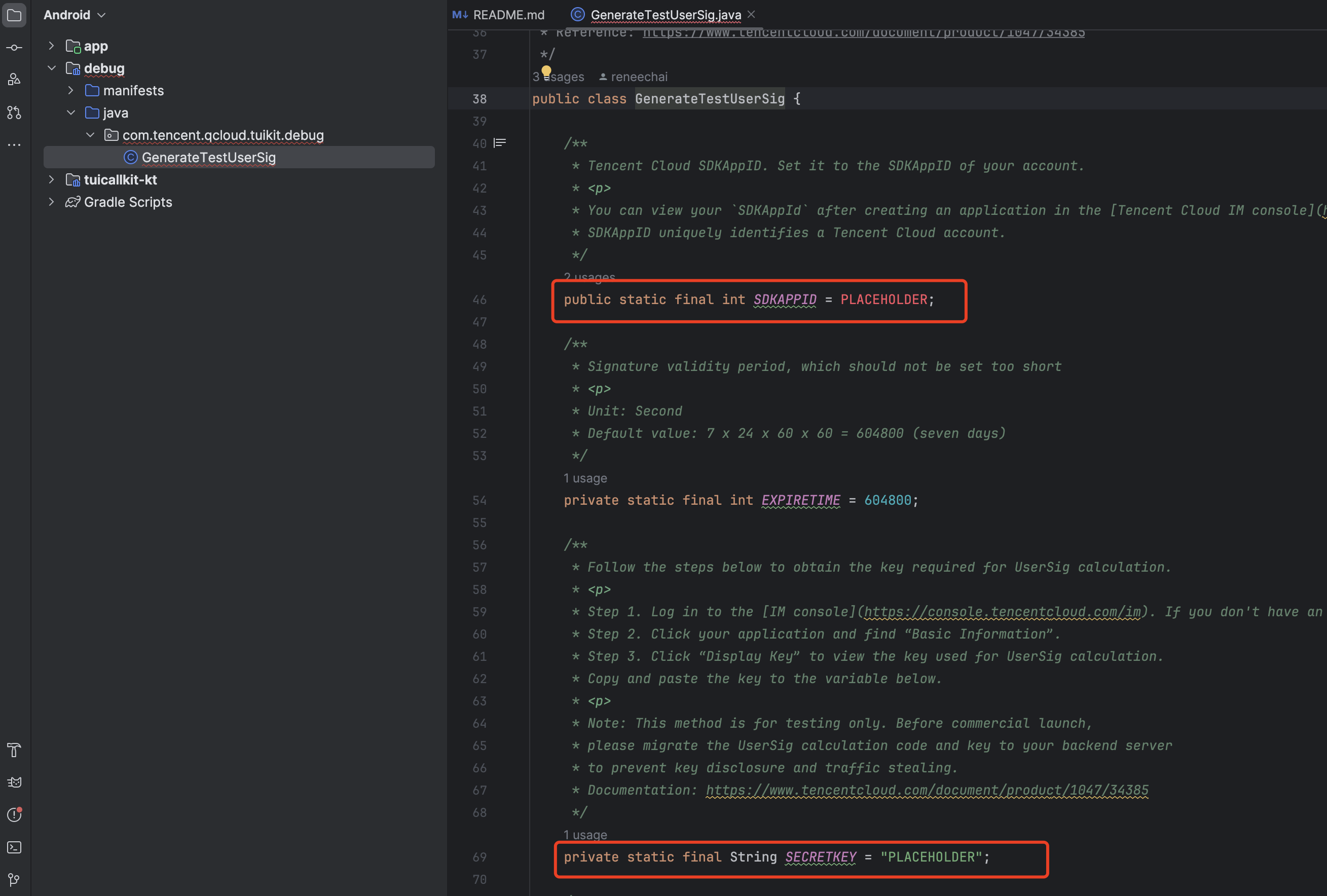 2. Android/debug/src/main/java/com/tencent/qcloud/tuikit/debug/GenerateTestUserSig.javaファイルを開き、サービスをアクティブ化する時に取得した対応する SDKAppID と SDKSecretKey を入力します。