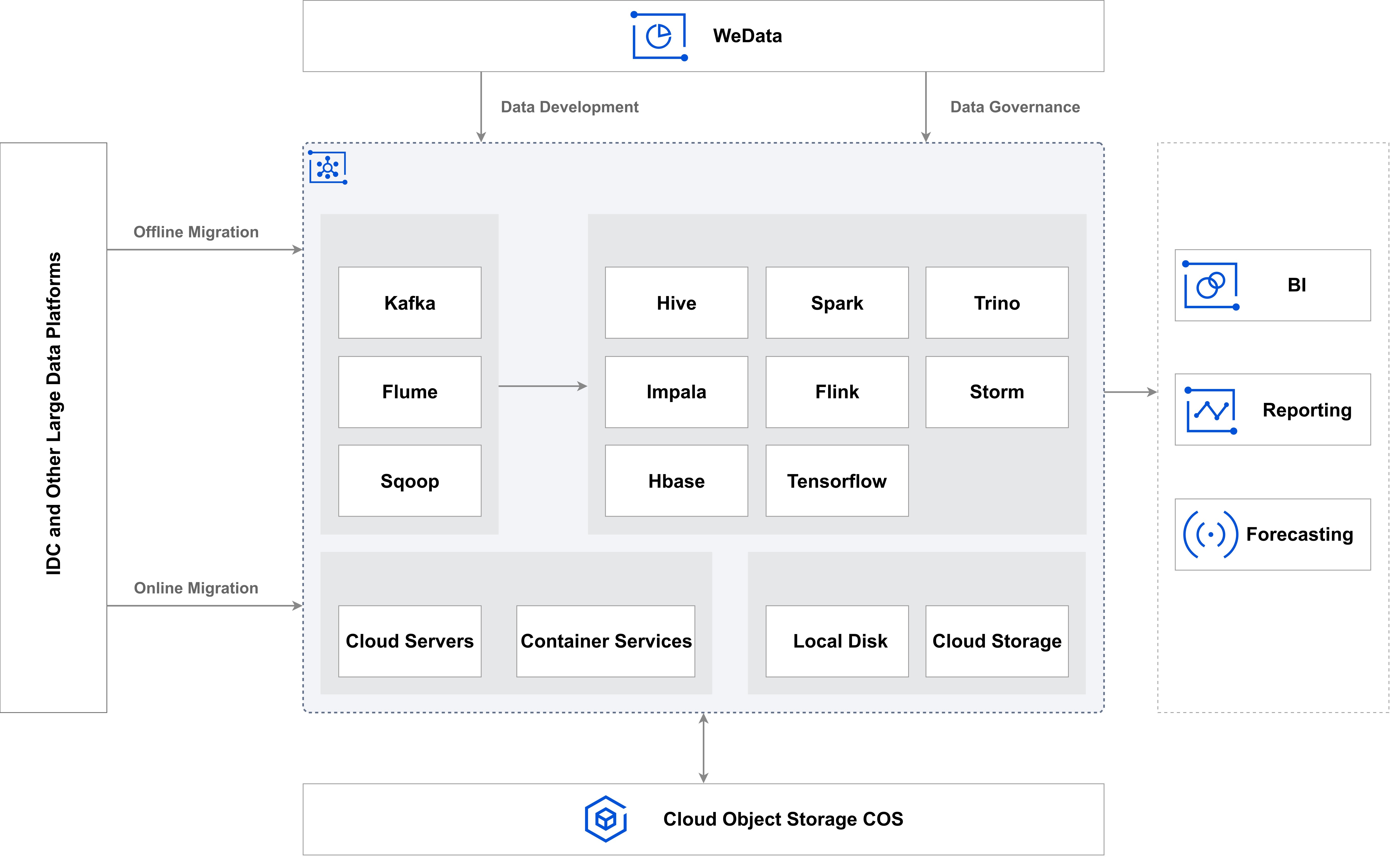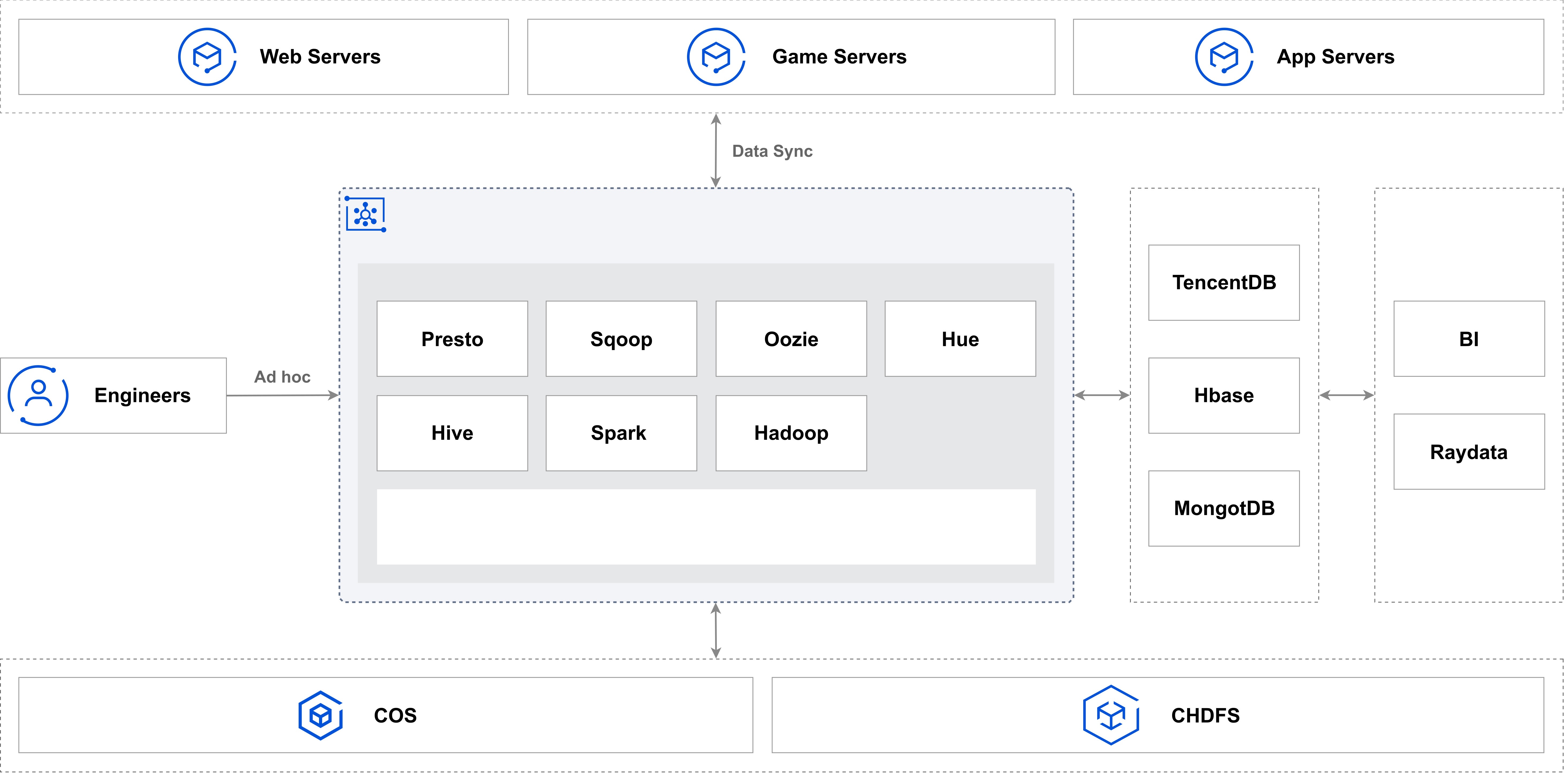 Elastic MapReduce(EMR)は、クラウド技術をHadoop、Hive、Spark、Hbase、Presto、Storm などのコミュニティオープンソース技術と連携し、安全、低コスト、高信頼性、柔軟に拡張可能なクラウドホスティング Hadoop サービスを提供します。EMR を使用すると、数分以内に安全で信頼できる専用の Hadoop クラスターを作成し、クラスター内のデータノードまたは Cloud Object Storage (COS) に保存されているペタバイト規模のデータを分析できます。