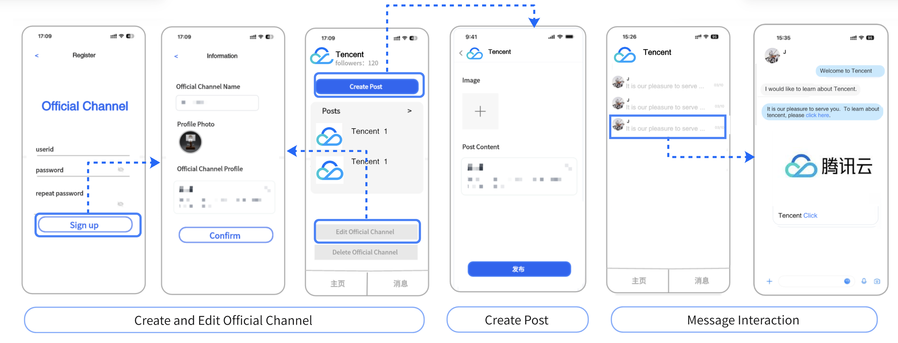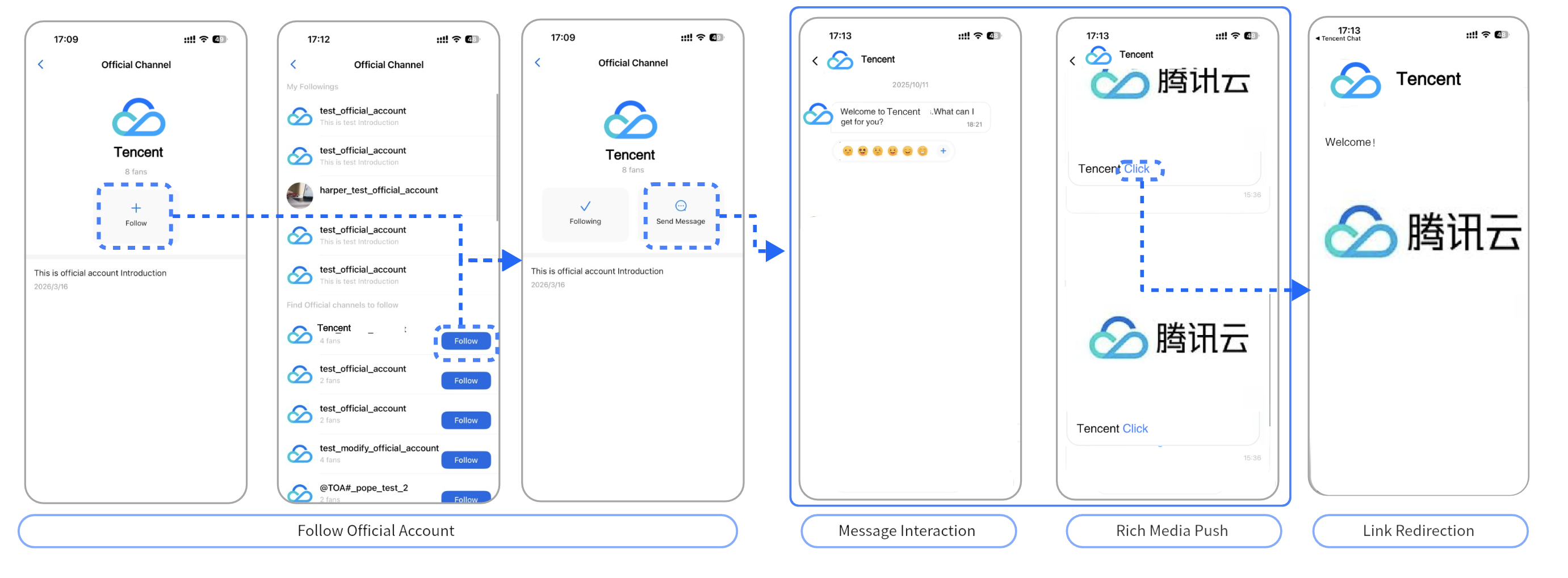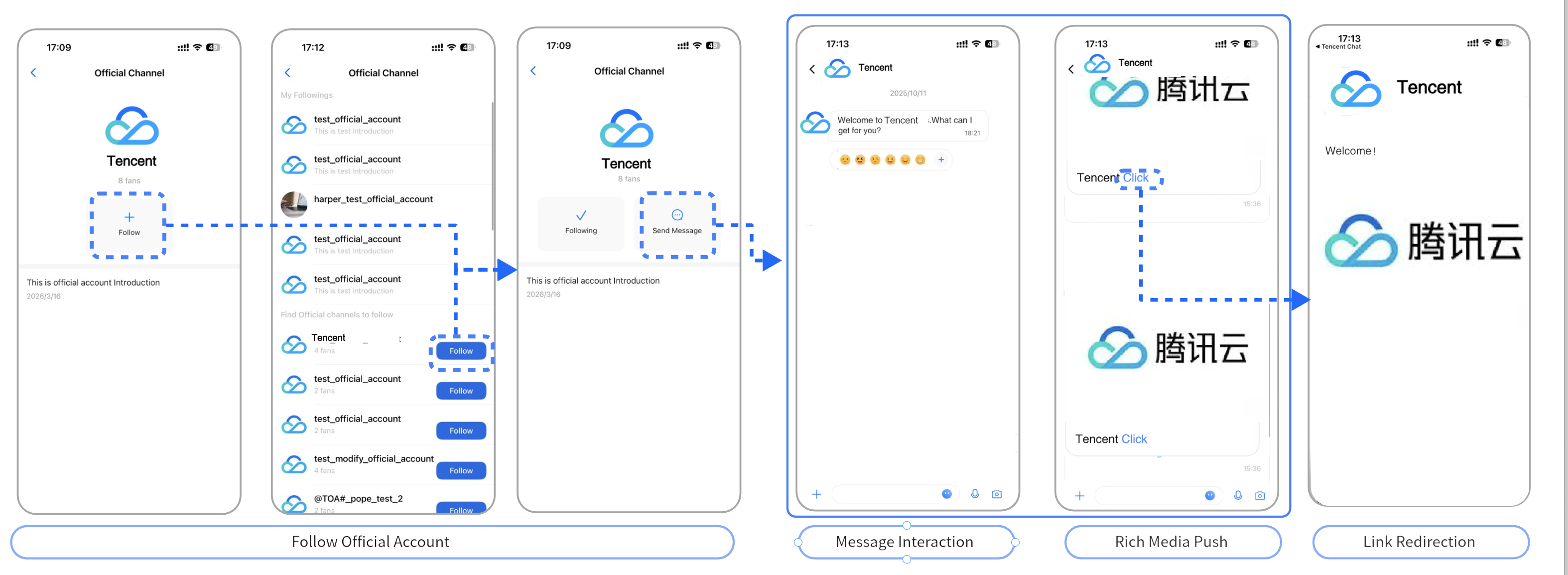 Official Accounts provide a trusted platform for broadcasting information, enabling organizations to quickly share news, updates, and knowledge with a broad audience using rich media formats. | Businesses leverage Official Accounts to deliver brand stories, product announcements, and targeted content directly to users, strengthening brand recognition and influence. | Official Accounts support high-frequency service features, such as online transactions (including transfers and appointment bookings) and information lookups (such as logistics tracking and grade inquiries), offering convenient self-service capabilities for subscribers. | Official Accounts serve as practical guides for local communities by aggregating relevant information—such as locations of community vaccination sites—through rich media, enhancing day-to-day convenience for subscribers. |