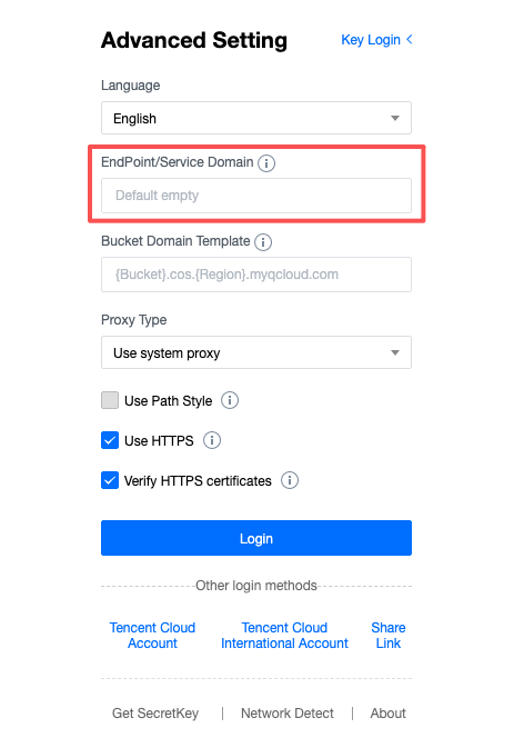 endpoint is your COS domain name.vi .cos.conf# Configuration file content:[common]secret_id = AKxxxsecret_key = SKxxxbucket = 12345-1309118522region = ap-guangzhouendpoint = cluster-xxxx.cos-cdc.ap-guangzhou.myqcloud.commax_thread = 5part_size = 1retry = 5timeout = 60schema = httpanonymous = False