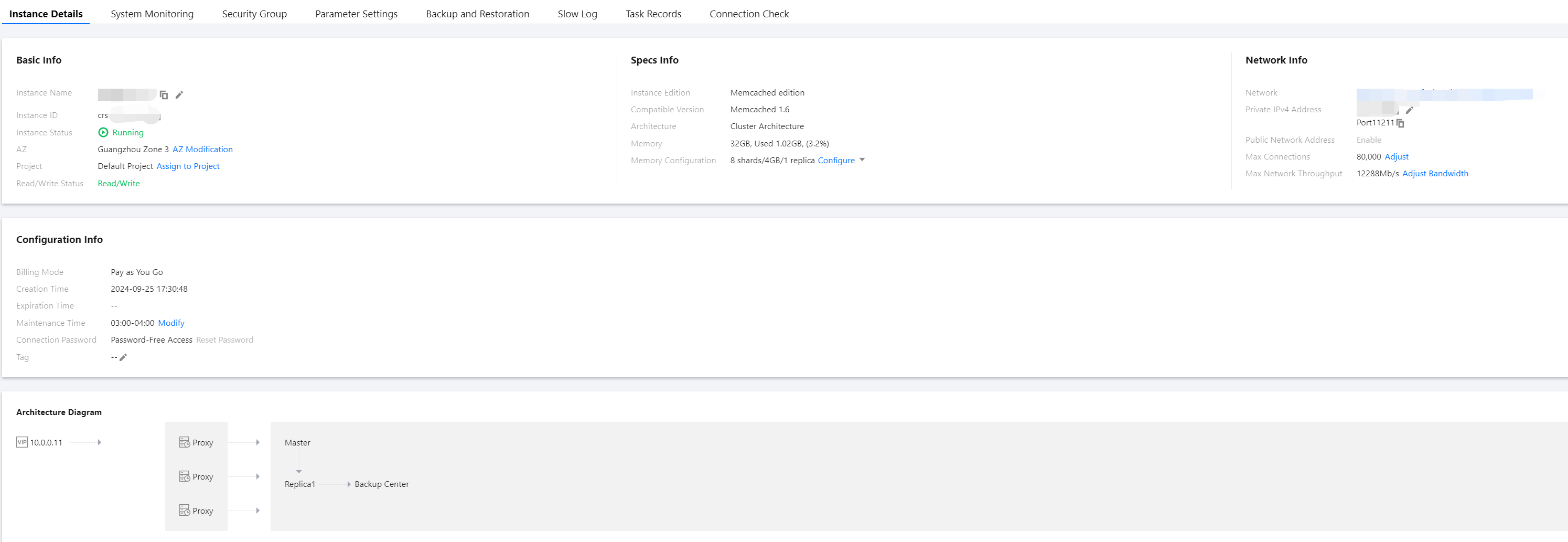 The memory configuration specifications of the purchased instance include: number of shards/memory capacity per shard node/replica quantity. Click Configuration Change to adjust the node memory capacity, number of shards, and number of replica nodes. For details, see Changing Instance Specifications.