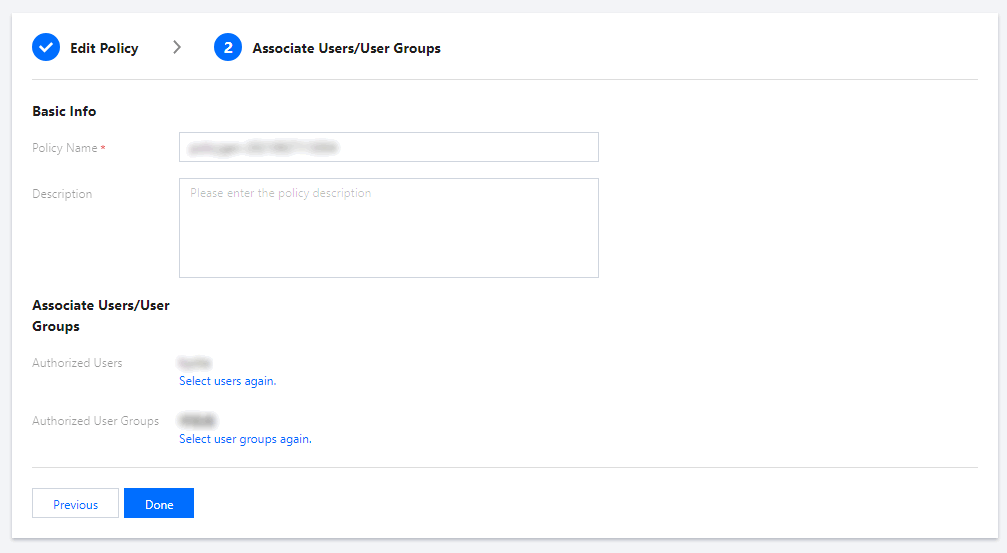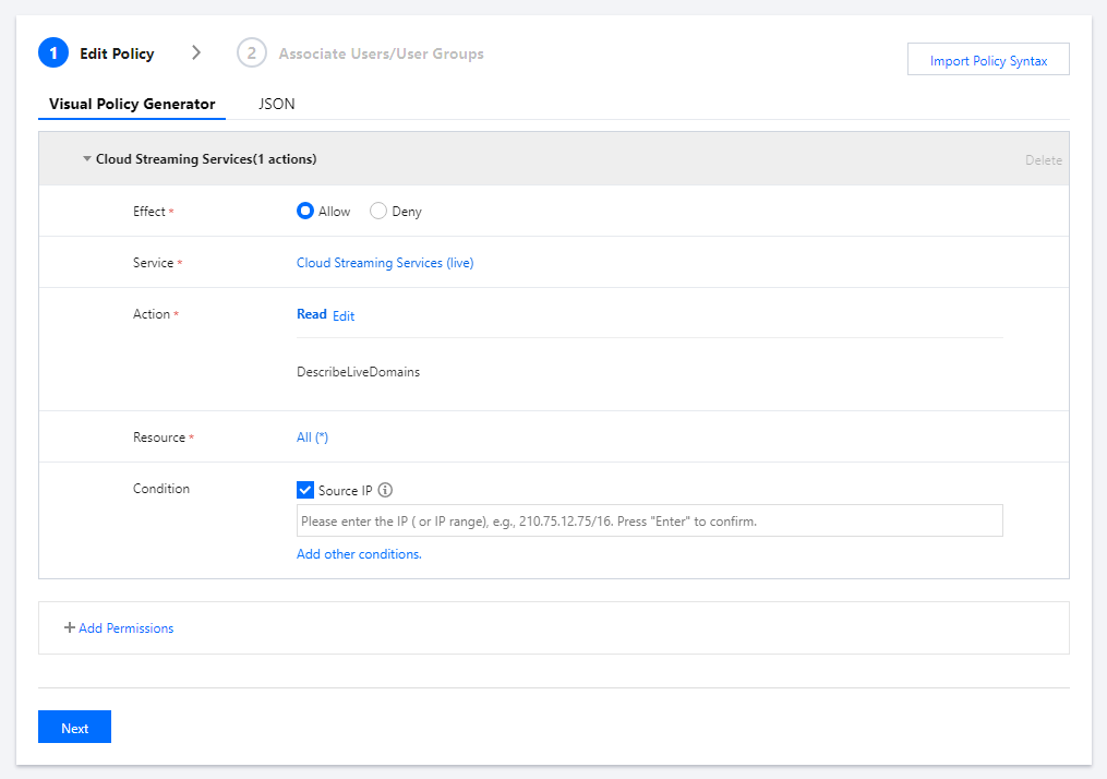 2. 다음을 클릭하여 정책을 생성합니다. 그 다음 상기 두 가지 방법 중 하나를 사용하여 사용자/사용자 그룹과 연결합니다.