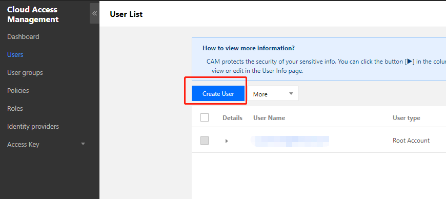 루트 계정은 하나 또는 다수의 서브 계정을 생성하여 특정 역할 및 정책을 할당할 수 있습니다. 서브 계정은 확인된 ID와 자격 증명을 가지고 있으며 콘솔에 로그인하여 설정을 완료할 수 있습니다. 동시에 API 액세스 권한도 가지고 있습니다. 다음 이미지와 같이 Tencent Cloud 콘솔에 로그인한 후 액세스 관리 페이지로 이동하여 사용자를 생성할 수 있습니다.