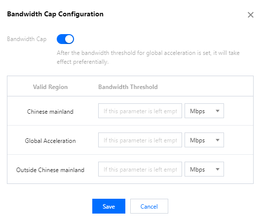 3. 대역폭 제한을 켜고 다음 설정을 완료합니다. 제한 리전은 재생 도메인의 가속 리전에 의해 결정됩니다. 자세한 내용은 사용 제한을 참고하십시오. 대역폭 한도를 입력합니다.