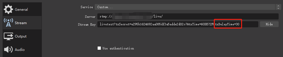 2. 푸시 스트리밍 뒤에 txDelayTime 매개변수를 추가하고, OBS를 통해 푸시 스트리밍합니다. 구체적인 작업 방법은 OBS 푸시 스트림을 참고하십시오.