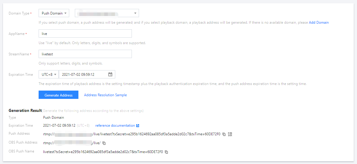 인터페이스를 호출하면 캐시 설정까지 포함될 수 있고 적용 시간을 통제하기 어렵기 때문에 인터페이스 방식은 권장하지 않습니다. 푸시 스트림 주소 뒤에 직접 매개변수를 추가하는 방법을 통한 빠른 구현을 권장합니다.