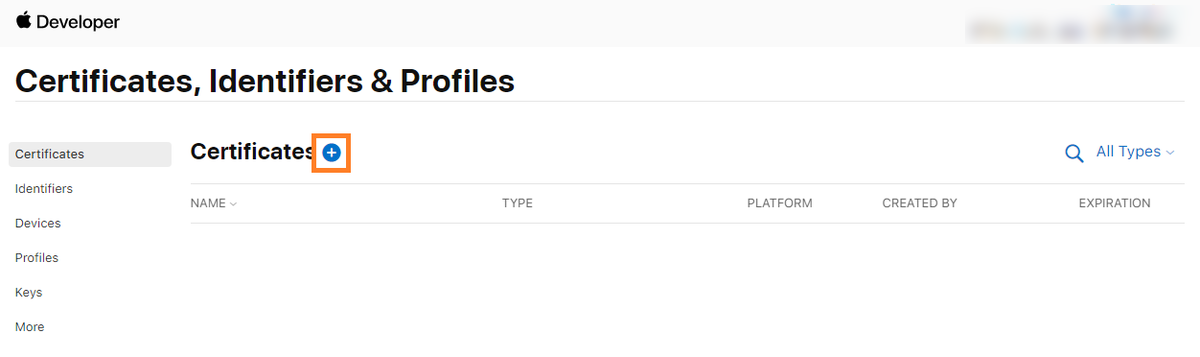 2. + 를 클릭하여 Create a New Certificate 페이지로 이동합니다.