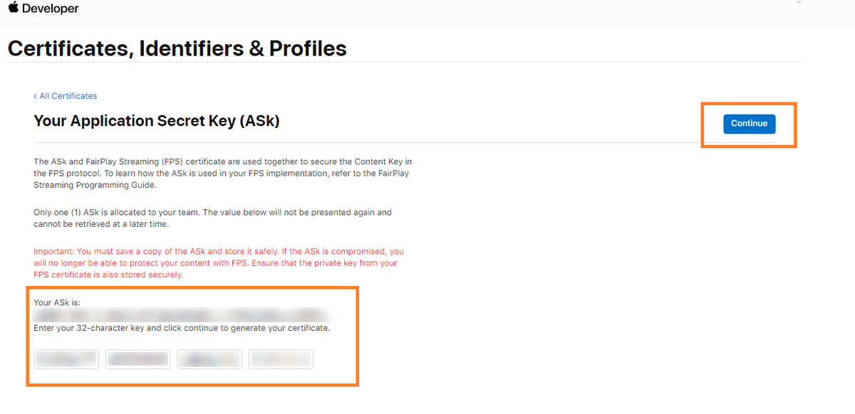 5. Application Secret Key (ASK)를 복사하여 저장하고 아래 입력 필드에 붙여넣고 Continue를 클릭합니다.
