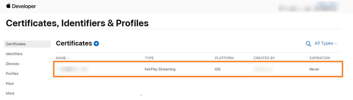 7. 상기 단계가 완료되면 FairPlay Streaming type으로 생성된 FPS 인증서가 Certificate 목록에 나타납니다.