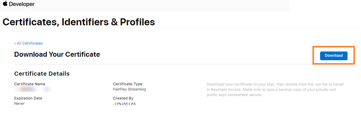 8. Download를 클릭하여 FPS 인증서(fairplay.cer)를 다운로드합니다.