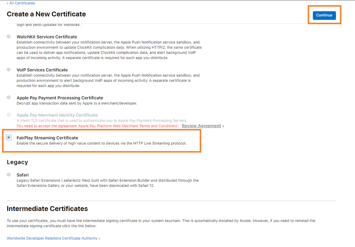 3. FairPlay Streaming Certificate를 선택하고 Continue를 클릭합니다.