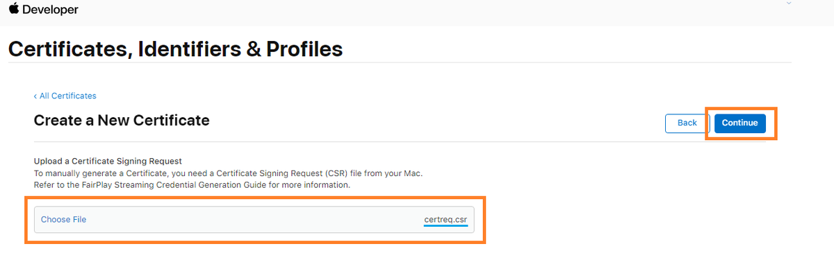 4. Choose File을 클릭하고 생성된 certreq.csr 파일을 선택한 다음 Continue를 클릭합니다.