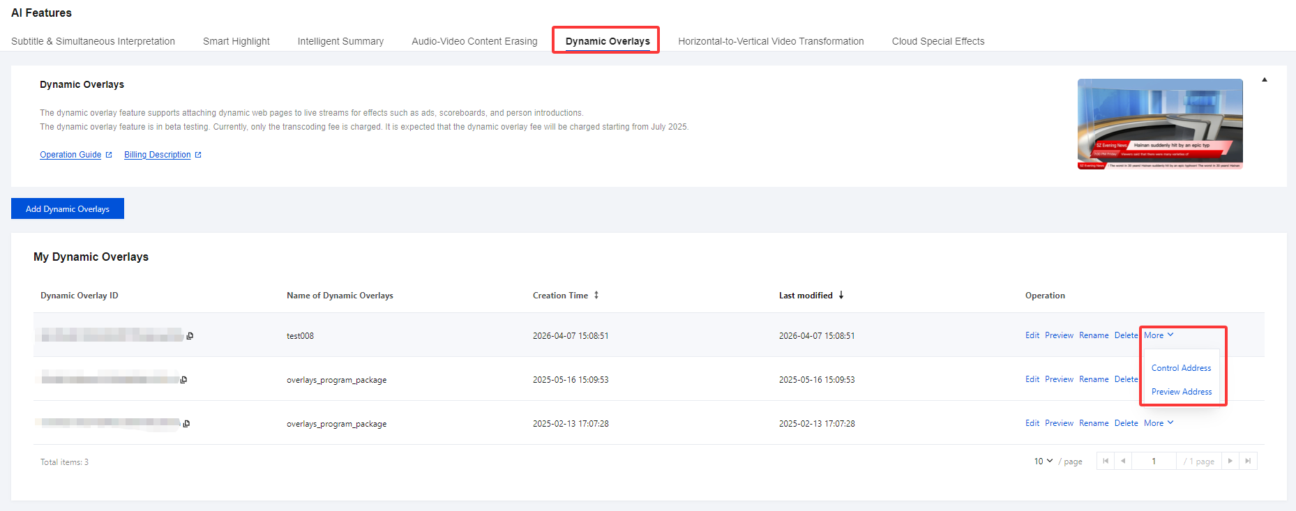 2. In the overlay list, select the corresponding dynamic overlay based on your business requirements, click More to expand, and copy the control address and preview address.