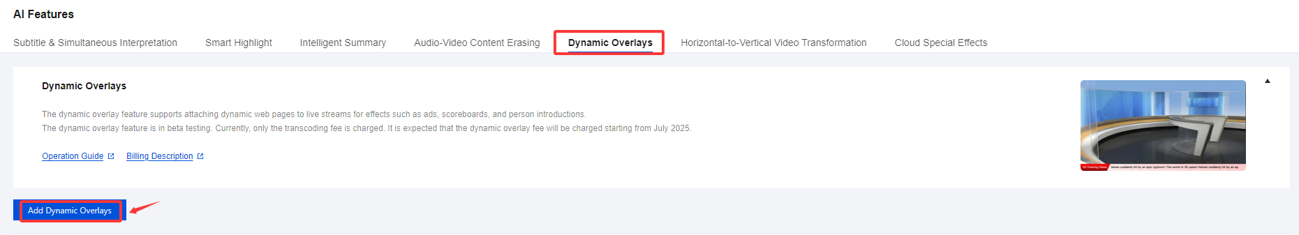 The dynamic overlay feature is currently in the beta testing phase. At present, only transcoding fees are charged.