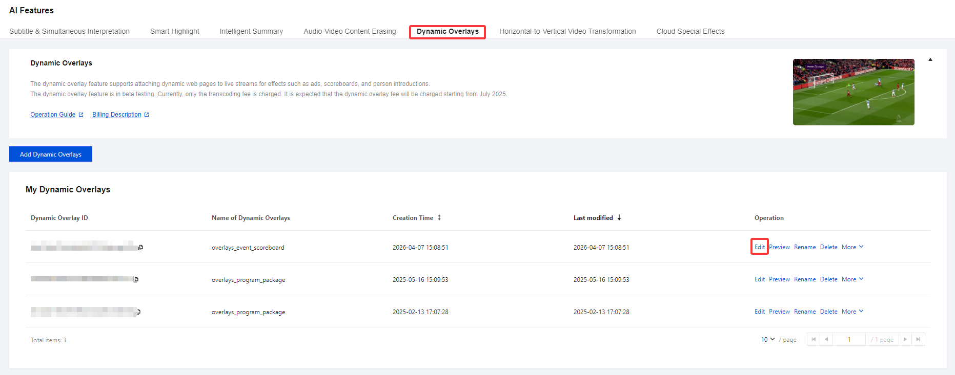 2. In the overlay list, select the dynamic overlay you want to edit based on your business requirements, and click Edit.