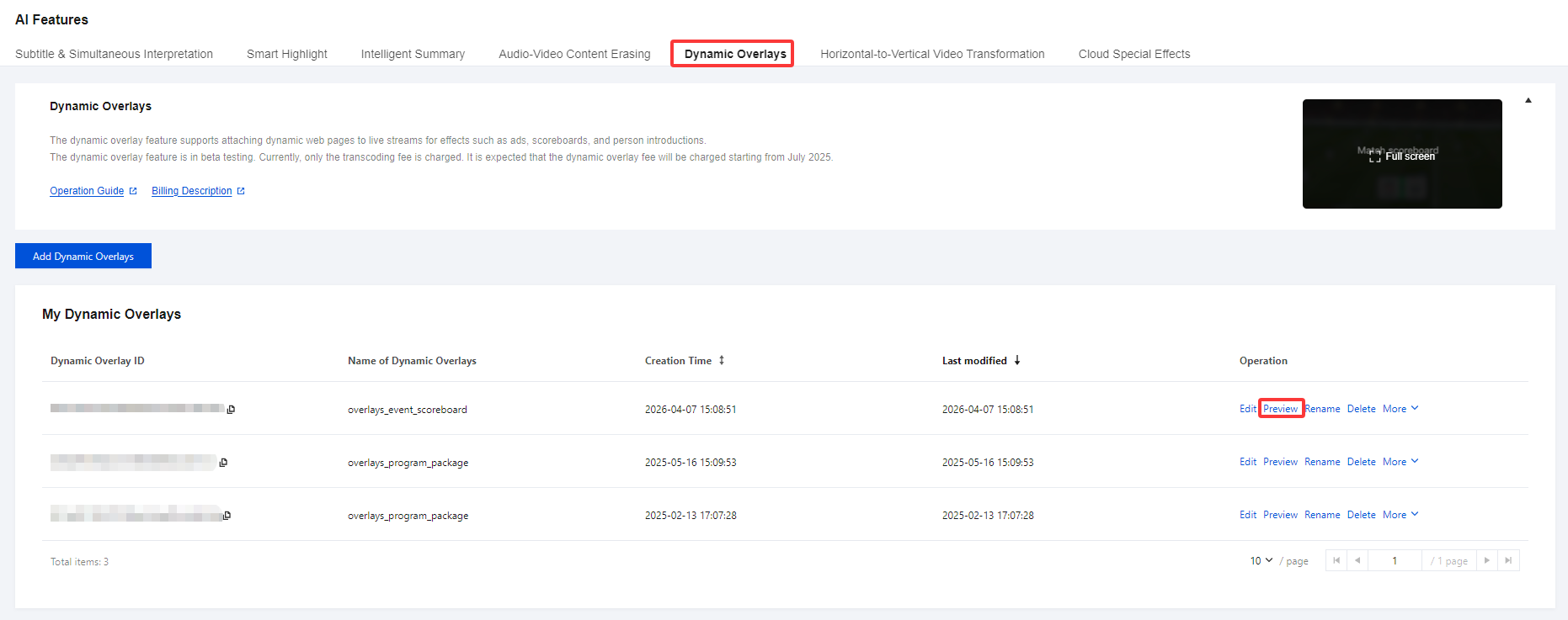 2. In the overlay list, select the dynamic overlay you want to preview based on your business requirements and click Preview to open the real-time preview window.